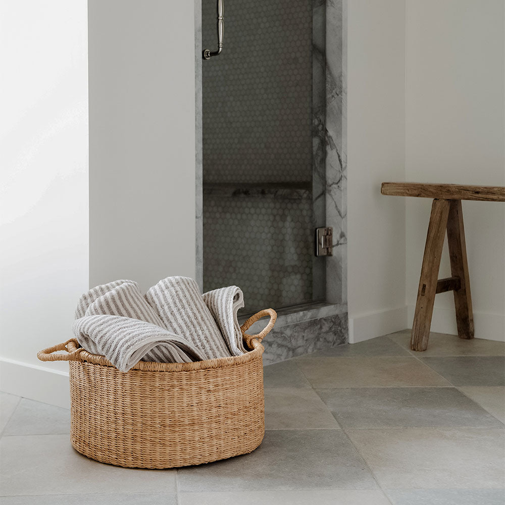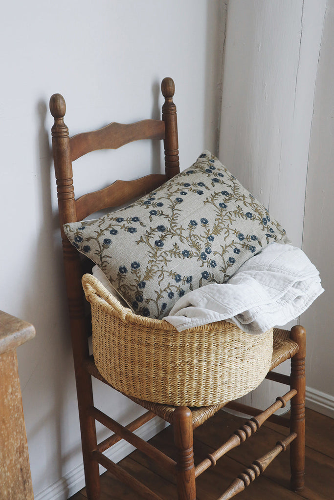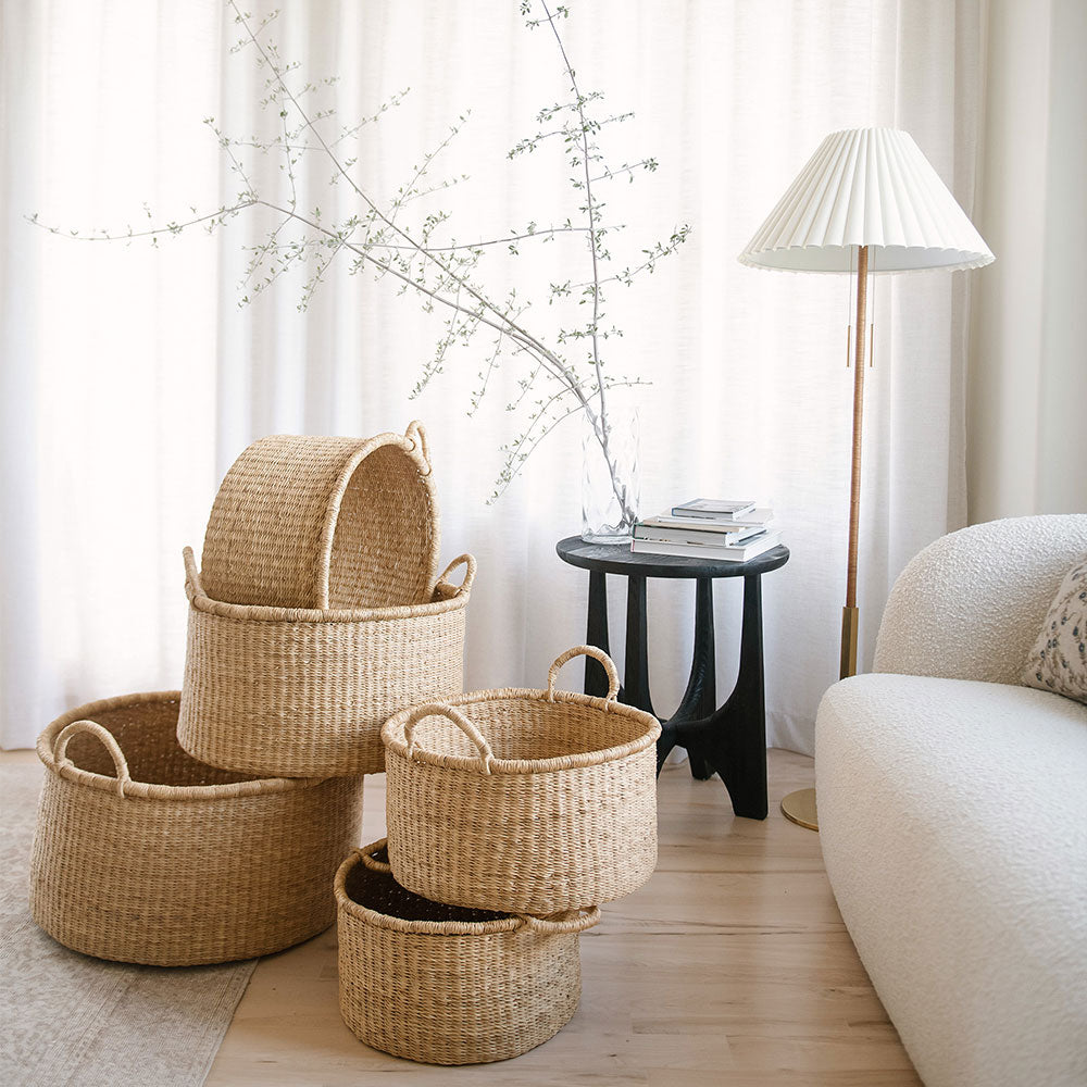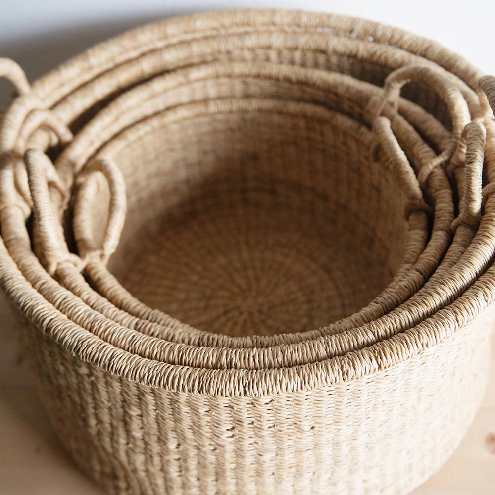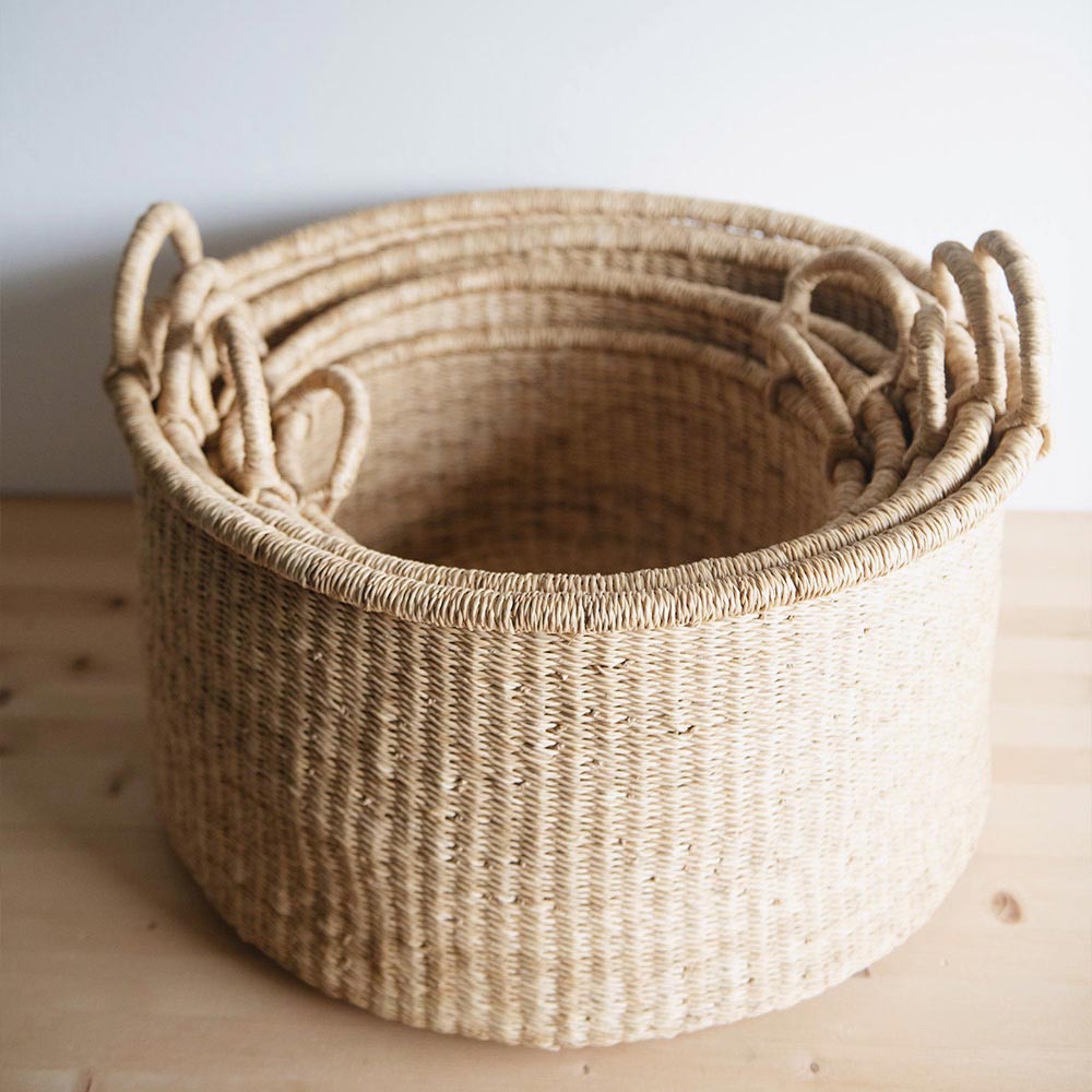Our large nesting floor baskets are perfect for pillows, blankets and toys. Artisans in the Bolgatanga region of Ghana weave these beautiful and durable garden baskets from thick, tough elephant grass. Bolga baskets stand up to use and abuse and remain functional and beautiful for years.